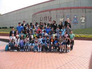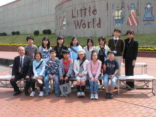 旅館を午前8時40分に出発,バスに乗って1時間弱,お楽しみの「リトルワールド」に到着しました。到着するとすぐに記念撮影,学校ごとと3校合同の2枚の記念写真を撮りました。