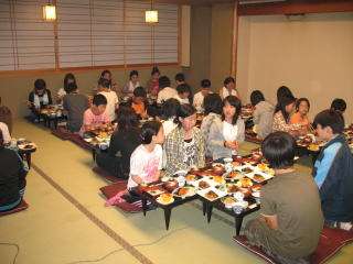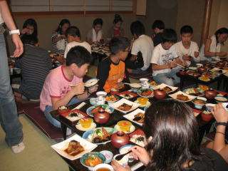 産業技術記念館の見学を終えて,午後5時過ぎに旅館に到着しました。旅館は名古屋駅から歩いて5分ほどの所にありました。玄関にはスロープや手すり,多目的トイレなどもあって,人に優しい設備を供えた旅館でした。到着するとすぐに旅館の方々とご挨拶,部屋に入って荷物の整理をするとすぐにお風呂でした。約30分のお風呂の次はお楽しみの夕食,献立は名古屋名物の「味噌カツ」に「きしめん」,「茶碗蒸し」,「エビチリ」,「煮つけ」など盛りだくさんでした。