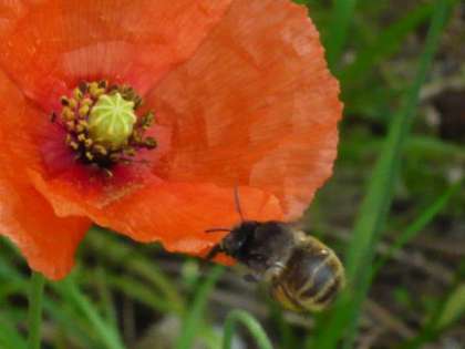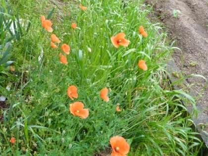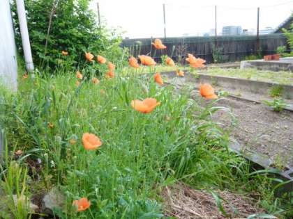 屋上の学校園では,ジャガイモやインゲンマメがスクスクと成長し,ホウセンカやヘチマが芽吹き始めました。そんな中,今年も「ポピー」が一部で群生していますが,このポピーの花にミツバチがおいしそうに蜜を吸いに来ていました。花から花へ,忙しそうに羽根を動かし,蜜を吸い終わって堪能すると,どこかへ飛び去っていきました。