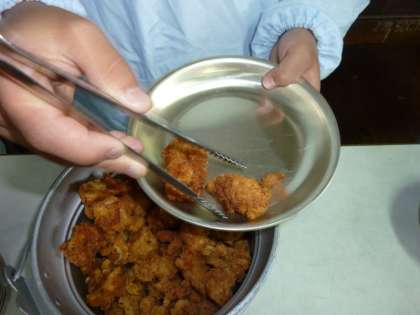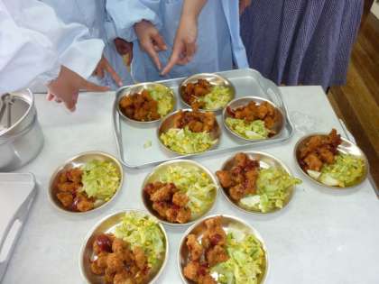 給食室で,鶏肉一切れずつていねいに衣をつけて揚げられた「チキンカツ」に,トマトケチャップやトマトピューレ,ウースターソースなどでつくられた手づくりのソースをかけて,とってもおいしくいただくことができました。
