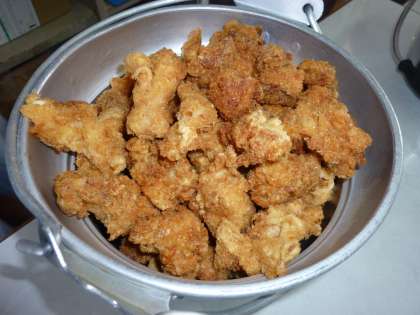 今日の給食は,子どもたちに大人気の「チキンカツ」でした。「チキンカツ」は,鶏肉に塩,こしょうをし,卵と水と小麦粉を合わせて衣をつけ,さらにパン粉をつけて油で揚げられていました。