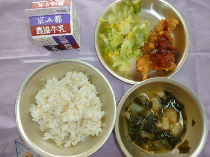 今日の給食の献立は,「玄米ごはん」,「牛乳」,「チキンカツ」,「ソティ」,「みそ汁」でした。給食調理員さん手づくりの「チキンカツ」はもちろんのこと,キャベツとコーンを塩,こしょう,サラダ油で味付けされた「ソティ」も,とてもおいしくいただくことができました。また,切りふとたまねぎ,生わかめの入った「みそ汁」は,「ごはん」や「チキンカツ」ととても合っていて,今日の給食の献立は子どもたちが大満足の献立でした。