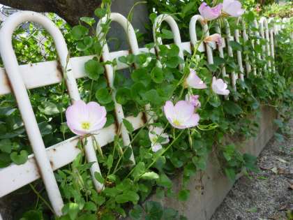 大変長い名前の「モモイロヒルザキツキミソウ(桃色昼咲き月見草)」の花が,運動場の南端,プールの北側の生垣に咲いています。