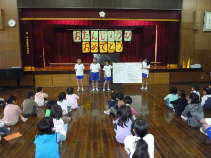 誕生日を迎えた喜びを味わい,抱負などを語ることにより命の大切さに気づかせたり,全校で誕生日を祝うことにより,一人一人が大切な存在であることを意識づけることをねらう,本年度第1回目の「誕生児童集会」が,1時間目に講堂でありました。今回の誕生児童集会では,4月生まれ6人,5月生まれ6人の,6月生まれ3人の,15人の子どもたちの誕生をお祝いしました。