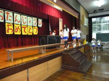 本年度第1回目の「誕生児童集会」が,1時間目に講堂でありました。今回の「誕生児童集会」では,4月生まれ6人,5月生まれ6人の,6月生まれ3人の,15人の子どもたちの誕生をお祝いしました。