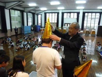 誕生月の子どもたち15人に,校長先生から「えんぴつ立て」と「しおり」,「黄金色のとんがり帽子」がプレゼントされました。15人の子どもたちは,校長先生から「とんがり帽子」をかぶせてもらって,とってもうれしそうでした。