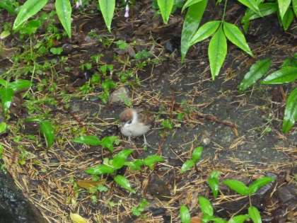 「チュンチュン」という親スズメを呼ぶ鳴き声が悲しそうに聞こえていましたが,親スズメも子スズメが気になるようで,何度も何度も子スズメの側に舞い降りてきていました。そして,大雨警報が解除され雨がやんだ午後3時すぎ,子スズメはどうしているだろうかと見に行くと,子スズメの姿はどこにもありませんでした。