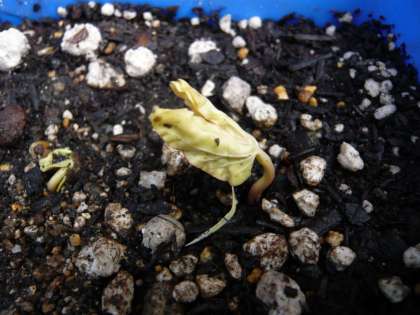 1年生の子どもたちが,青い鉢に種を蒔いて大切に育てていた「アサガオ」が,しっかりと水やりの世話をしたおかげで,画像でご覧のように発芽しました。