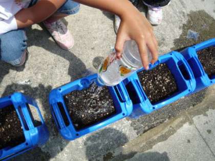 アサガオの種をまき終わると,周りに肥料を置いてから,ペットボトルに入れた水をたっぷりとかけてあげました。