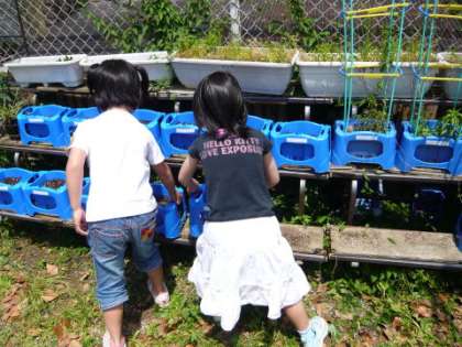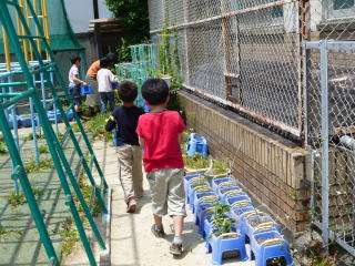 肥料を置いて,水もたっぷりとあげて,最後は日当たりのよい場所に鉢を並べました。水を欠かさずあげて世話をしっかりと行い,大きなアサガオの花が咲くことを願っています。