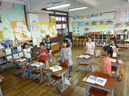 1年生の子どもたちは,「せいじゃのこうしん」や「たぬきのたいこ」の音楽のリズムに合わせて,上手に「カスタネット」や「タンバリン」を使って拍打ちをしていました。入学して2ヶ月が経った1年生の子どもたちは,学校生活にもすっかりと慣れて,学習に,遊びに,給食に…,何にでもがんばって取り組んでいます。