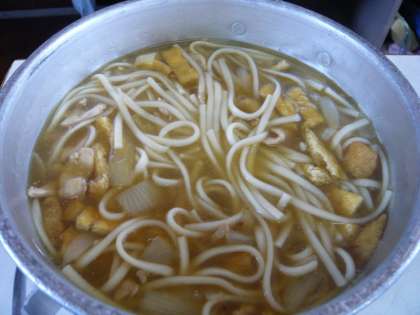 もちもちとした麺に,「鶏肉」や「タマネギ」,「油揚げ」の具がたっぷりと入っていて,とってもおいしく「カレーうどん」をいただくことができました。カレーのだしは,だし昆布と削り節,調味料は,カレー粉の他に濃い口醤油や砂糖などが入っていて,カレーの味も最高でした。
