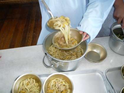 今日の給食は子どもたちに大変人気のある,「カレーうどん」でした。