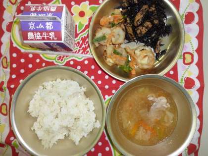ちなみに今日の給食の献立は,「麦ごはん」,「牛乳」,「かきあげ」,「ひじきの煮つけ」,「キャベツの吉野汁」でした。「むきえび」に「ちくわ」,「にんじん」,「三度豆」が食材の「かきあげ」,「ひじき」と「油あげ」がほどよく味付けされた「ひじきの煮つけ」,「鶏肉」と「キャベツ」,「にんじん」が入った「キャベツの吉野汁」,今日の給食の献立は盛りだくさんで,とってもおいしく,お腹いっぱいになりました。ごちそうさまでした。(^o^)