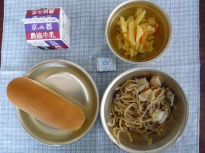 ちなみに今日の給食の献立は,「小型コッペパン」,「牛乳」,「じゃがいものピリカラいため」,「チーズ」でした。