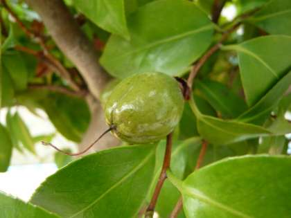 運動場の南側,プールの北に育つ「ツバキ」に,画像下でご覧のようなツヤツヤとしたツバキの実がなっています。