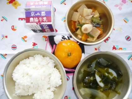 今日の給食の献立は,「ごはん」,「牛乳」,「プリプリ中華いため」,「わかめスープ」,「みかん」でした。「プリプリ中華いため」の時にはいつもスープがついていますが,今日は「わかめスープ」でした。「わかめスープ」には,「生わかめ」と「たまねぎ」の他に,「トック」という韓国のお餅も入っていて,「プリプリ中華いため」と一緒においしくいただきました。また,今日はやや暑さを感じる日で,冷凍された冷たい「みかん」が,子どもたちに好評でした。