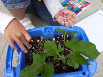 支柱を立てる前に,青色の「アサガオ」の植木鉢に「こやし」を入れてあげました。次に担任の先生から支柱の立て方を聞いて,少し難しかったけれども,がんばって支柱を立ててあげました。