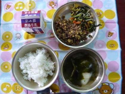今日の給食は「ビビンバ」でした。「わかめスープ」には,「トック」という韓国のお餅も入っていて,子どもたちに大好評でした。