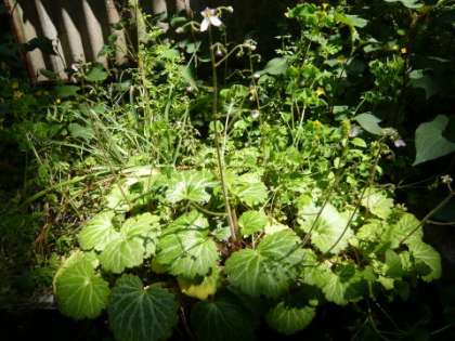 学校の北隣の「ゑびす神社」との壁際に,「ユキノシタ」が独特の形をした華麗な花を咲かせています。この「ユキノシタ」,開花期の葉を乾燥させたものは,「虎耳草(こじそう)」という生薬になるそうですし,また葉は山菜として天ぷらやおひたしにして賞味されるそうです。
