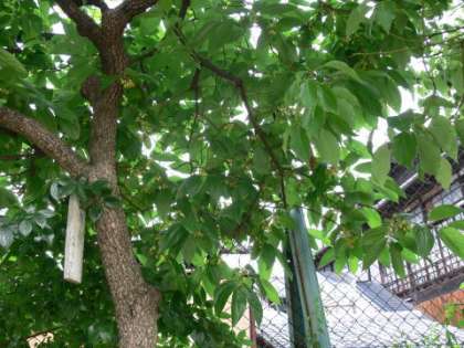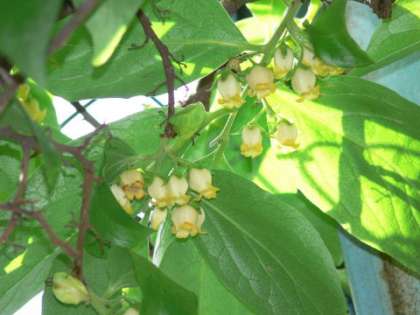 学校の運動場の南西にそびえる「クスノキ」に並んで立つ「柿の木」に,1cmほどのかわいい花が咲いています。この柿の花は,時期が来るとボトボトと音を立てるように地面に落ちてしまうそうです。