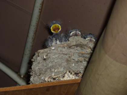 そのような中,あるツバメの巣が騒がしいのでのぞいてみると,画像中と下でご覧のように,孵ってからまだ日があまり立っていないであろう,ツバメのヒナを発見しました。まだ毛が生えそろっておらず,弱々しいヒナですが,口を大きく開けて親鳥が運んでくる餌を食べたそうにしていました。ツバメのヒナの数は3羽,今年最後のヒナと思われます。元気に巣立つことを,願っています。