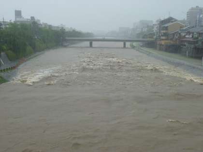 学校では各学年の教室で,鴨川が大変危険な状態になっていることを担任が子どもたちに話し,鴨川に近づかないように注意を促しています。各家庭でも,子どもたちへの配慮をよろしくお願いします。川の水量は,雨がやんでからなお増水します。雨がやんだからといって,安心はできません。雨上がり後の注意が,最も必要です。