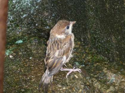 前回の大雨警報の時にも「子スズメ」が巣から落ちて,校内をヨチヨチと歩いているところを見かけましたが,前夜から発表されていた大雨警報の昨日も,運動場の南隅をヨチヨチと逃げまどう「子スズメ」を発見しました。