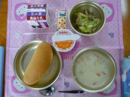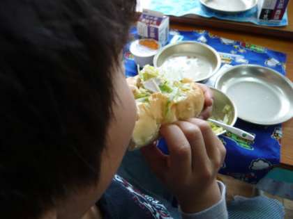 大きな口を開けてハムサンドを「パクッ」,とってもおいしいハムサンドでした。ちなみに今日の献立は,「コッペパン」,「牛乳」,「ハムサンド」,「チャウダー」,「みかんゼリー」でした。