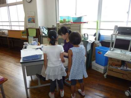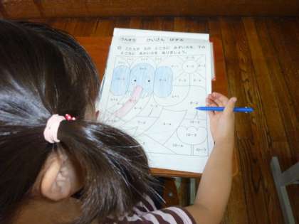 初めての夏休み,そして初めての「チャレンジ学習」に取り組む1年生の教室では,算数の計算のプリントをがんばって行っていました。1枚やり終えるごとに担任の先生の所にもって行き,すぐに丸つけをしてもらっていました。9人の1年生の子どもたち,「チャレンジ学習」にしっかりとがんばって取り組んでいます。