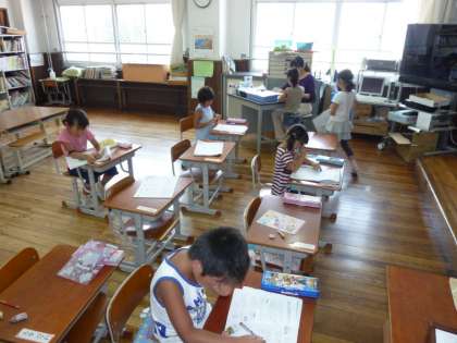 夏休み中の最初の1週間,子どもたちは午前9時までに集団登校をして,約1時間30分から2時間の「チャレンジ学習」に励みます。初日の今日の「チャレンジ学習」の参加率は,ほぼ100パーセントでした。この「チャレンジ学習」は今日26日(月)から30日(金)までの5日間実施し,子どもたちは国語と算数を中心とした学習にがんばって取り組みます。