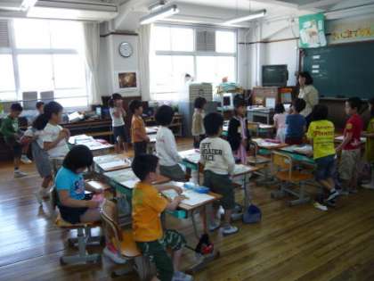 「午前10時10分,2階理科室より出火,隣接教室等に燃え広がるおそれがあり,全員を避難させる必要がある」ことを想定して,今年度第1回目の「避難訓練」を2時間目後半に実施しました。非常ベルが鳴り緊急放送が流れると,各教室の子どもたちは一斉に行動を中止して放送に聞き入りました。避難の放送を聞いて,担任の先生を先頭に「お・は・し・も・て」の約束を守って素早く運動場に避難しました。運動場に避難して整列した子どもたちは,校長先生の講評にしっかりと耳を傾けていました。今日の避難訓練は,避難開始から避難完了まで1分58秒の好成績でした。本校では防犯訓練1回を含めて,年間4回の避難訓練を実施する予定です。