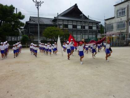2時間目の全校練習は,「入場行進」から始まりました。児童会役員4人がもつ校旗を先頭に,優勝旗,応援旗,1年生,2年生,3年生,4年生,5年生,6年生の順に,行進曲に合わせて力強く入場の練習をしました。初めて運動会に参加する1年生も,しっかりと手を振って,姿勢良く行進していました。