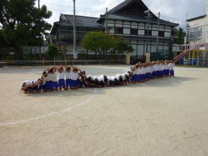 最初は波が早すぎて見栄えがしなかった画像上の「ウエーブ」も,ゆっくりとしたテンポで波がつくれるようになりました。どの技をするにも4〜6年生の子どもたちは,息をそろえてしっかりとがんばって練習しています。