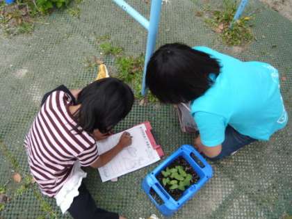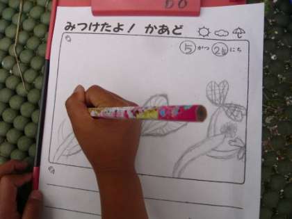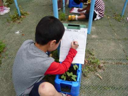 1年生が大切に育てている「アサガオ」,今日は1年生がアサガオをしっかりと見て,「みつけたよカード」に観察記録を書いていました。アサガオの育ちをスケッチしたり,アサガオの今の様子を言葉に書いたりしていましたが,見られているアサガオはとってもうれしそうでした。