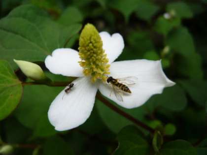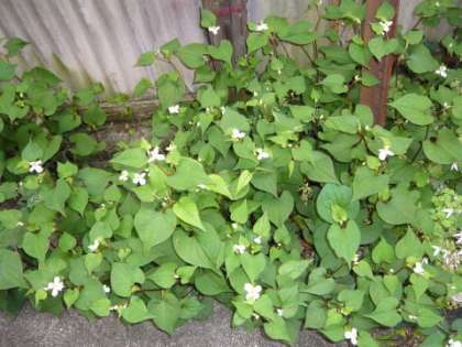 日陰の湿った場所を好む「ドクダミ」が,プールの脇や恵美須神社の境目に,今年も花を咲かせています。このドクダミ,現在臭いはありませんが,もうすぐ特有の臭気が漂うものと思います。ドクダミの開花期の地上部を乾燥させたものは,「十薬(じゅうやく)」という生薬になり,その煎液は利尿作用や動脈硬化の予防作用があるそうです。