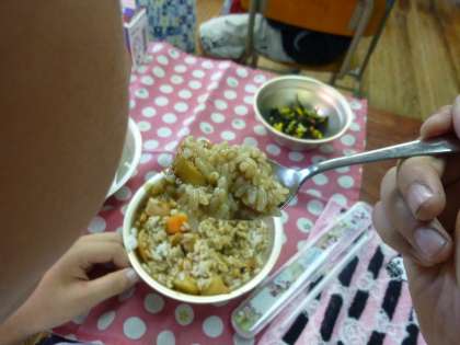 シーフードカレーは,海老とイカの海の幸とともに,じゃがいも,たまねぎ,にんじん,しょうが,にんにくが入り,カレー粉の他に,トマトピューレやフルーツチャツネ,ソース2種などでルーがつくられ,とっても味わいの深い,おいしいカレーになっていました。ご飯にシーフードカレーをかけて,スプーンでご飯とシーフードカレーをしっかりと混ぜて,スプーンですくって大きな口を開けてパクリ。いつもとは少し違うカレーでしたが,子どもたちはシーフードカレーに大喜びでした。