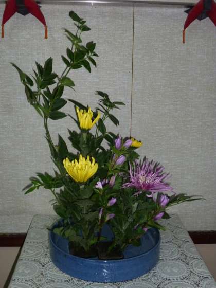 [今月の花材は,「そけい」,「菊」,「りんどう」です。]