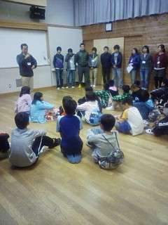 今夜は、キャンドルファイヤーです。その準備の様子ですが、5校の子どもたちが一緒になってグループを組み、協力して出し物を行うようです。初日は少しぎこちない雰囲気だったのが、今では嘘のように和気あいあい。とてもいい雰囲気です。