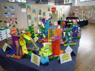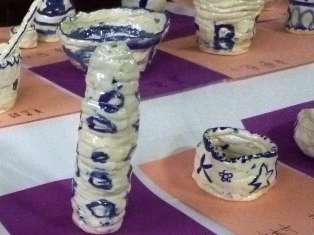 4年生は,『わたしのすきな清水のまち』の絵,工作『コロコロコロガラート』,そして,陶器の作品を展示しました。『わたしのすきな清水のまち』は,清水の町の中から自分の好きな場所を選んで,遠近法を意識しながら描きました。細かな部分まで丁寧に彩色して作品を仕上げました。コロコロガーラードは,スタートからゴールまでビー玉がうまく転がっていくように工夫して作りました。作っているときには,何度も何度もビー玉を転がし,試行錯誤を繰り返しながら苦労しました。陶器の作品は,縄のようにした粘土を高く積み上げて作っていきました。素焼きの次に,釉薬で絵を描いて仕上げました。