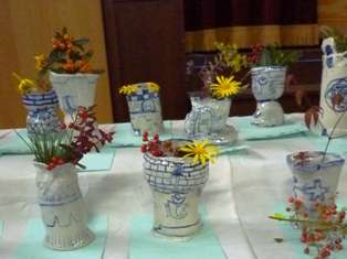 6年生は,『行ってみたいワンダーランド』の版画,工作『未来に生きる』,そして,5年生と一緒につくった陶器の花瓶を展示しました。『行ってみたいなワンダーランド』は,頭の中に描いた夢の世界を,多色刷り版画であらわしました。重なる色合いを考えながら,彫って刷る,彫って刷るを何度も繰り返して仕上げていきました。『未来に生きる』は,将来の夢と希望をテーマに,10年後,20年後の自分の姿を思い浮かべて作りました。紙粘土やダンボール,布や色紙など,いろいろな材料を工夫して作りました。陶器の花瓶は,花瓶の形や模様など,デザインを考えながら作りました。校内に咲いていた花を生けると素敵な感じになりました。
