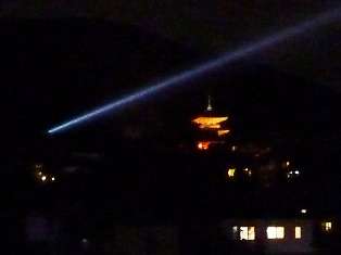 11月も半ばを過ぎ,本校校庭や周辺の山々の紅葉も鮮やかに色づいてきました。この時期に合わせて,毎年行われている清水寺の夜間拝観が,今週水曜日から行われています。ライトアップの光で照らし出された清水寺の塔,そして,西方浄土に向けて放たれているサーチライトの光。それらの幻想的な光景を,5・6年生の教室の窓から綺麗に見ることができます。また,反対側に目を向けると,ライトアップに照らされた八坂の塔を,北の方には,同じようにライトの中に浮かぶ高台寺も見ることができます。