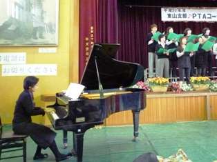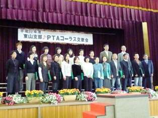 11月20日(土)。東山支部PTAコーラス交歓会が,今熊野小学校の体育館で開催されました。今年も,清水小学校のコーラスは,指揮は早川雅雄先生,ピアノ伴奏はJさんで出演されました。発表曲は,「時の旅人」と「親知らず 子知らず」の2曲です。どちらの曲もとても難しい曲でしたが,今までの練習の成果を出し切って,男性コーラスも加わった素晴しいハーモニーを会場に響かせておられました。発表が終わると,とても大きな拍手が送られていました。そして,みなさん,力を出し切ったというさわやかな笑顔で記念写真撮影をされていました。