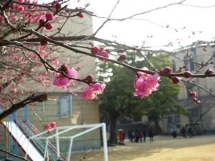 今,季節は寒の真っ最中。1年の中で最も寒いシーズンです。朝の最低気温も0度辺りまで冷え込む毎日が続いています。そんな寒い中ですが,運動場の北側に植わっている梅の木に,今朝かわいい花が咲いていました。先週末は,まだ,咲いていなかったのですが,この土・日は,少し温かかったので,その間に咲き出したようです。季節は,ゆっくりとですが,確かに春に向かっているのですね。