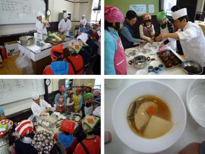 "鰹昆布だし"を試飲したり,大根とカブの食材のうまみを味わわせていただきました。そして,ぶり大根を炊いている間には,職人さんの素晴らしい包丁捌きを見せていただきました。鵜飼さんは,食を通じて,夢を持つこと,命を大切にすること,感謝することなど,人が生きていくうえで大切なことについて,いろいろなお話しをしてくださいました。今回の学習を通して,子供たちが食べる楽しさに関心を持ってくれたらいいなと思います。