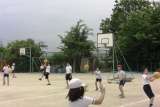 毎週水曜日に,運動部は,バスケットボールとソフトバレーボールに分かれて,練習をしています。バスケットボール部は,グランドで練習しています。パスやドリブルなどの基本技術を練習したり,ミニゲームをしたりしています。