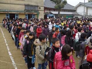 今日は,開睛館のそばにある六原小学校のグランドに集合しました。開睛館に通うう児童・生徒全員が集まったのは,今日が,初めてでした。たくさんの友達やお兄さん,お姉さんが集まったので,少しびっくりしていた子どももいたようです。六原校の校長先生の話があった後,代表の児童・生徒が,挨拶とお礼の言葉を発表してくれました。4月からは,今日のようにみんなで協力して,安全に気をつけて通学していきたいと思います。