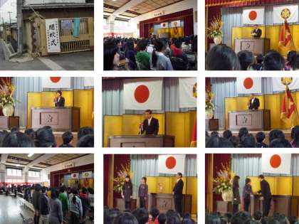 写真上…左から 正門,会場,PTA会長挨拶