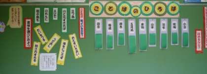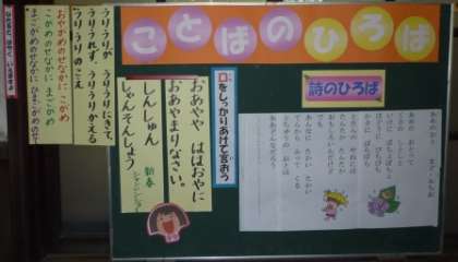 講堂前の掲示板と東校舎1階の廊下に,国語に関係する掲示コーナーができました。季節に合わせた詩,諺や特別な読み方をする熟語,話し方の練習になる言葉など,子ども達につけてほしい国語の力の基礎になればと思います。