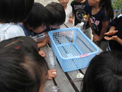 土日の間に,教室で育てていたヤゴ2匹がトンボになりました!あとには抜け殻がコロン!ところがっていました。みんなで「元気でね!」「また清水校に遊びにきてね!」とお話をした後,お空に放しました。1匹はすぐにとんでいきましたが,もう1匹はしばらくかごにとまったままで,1年生との別れを惜しんでいたのでしょうか,ようやく高いお空に向かってとびたっていきました。